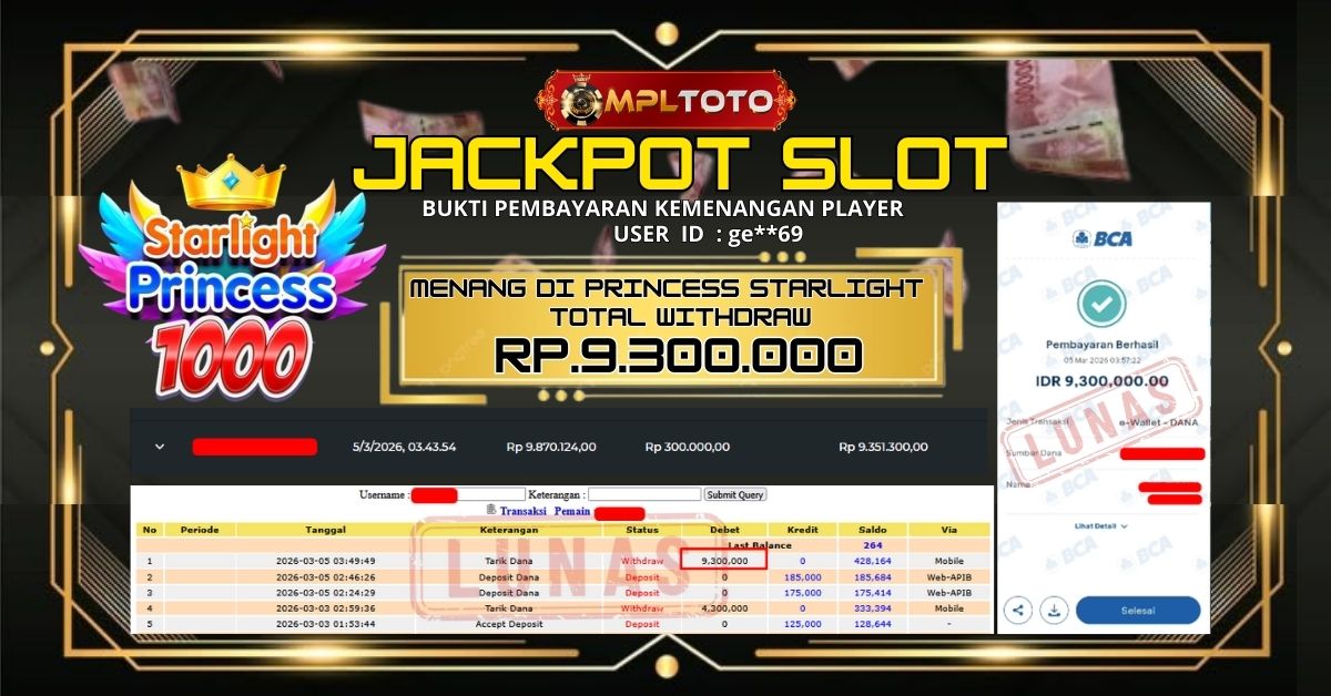 Selamat kepada Player setia MPLTOTO Userid : BILXXXX12 Jackpot 52 JUTA di game SLOT STARLIGHT PRINCES. AYO DAFTAR SEKARANG JUGA DAN RASAKAN SENSASI MAXWIN BERMAIN DI MPLTOTO.COM SEKARANG JUGA